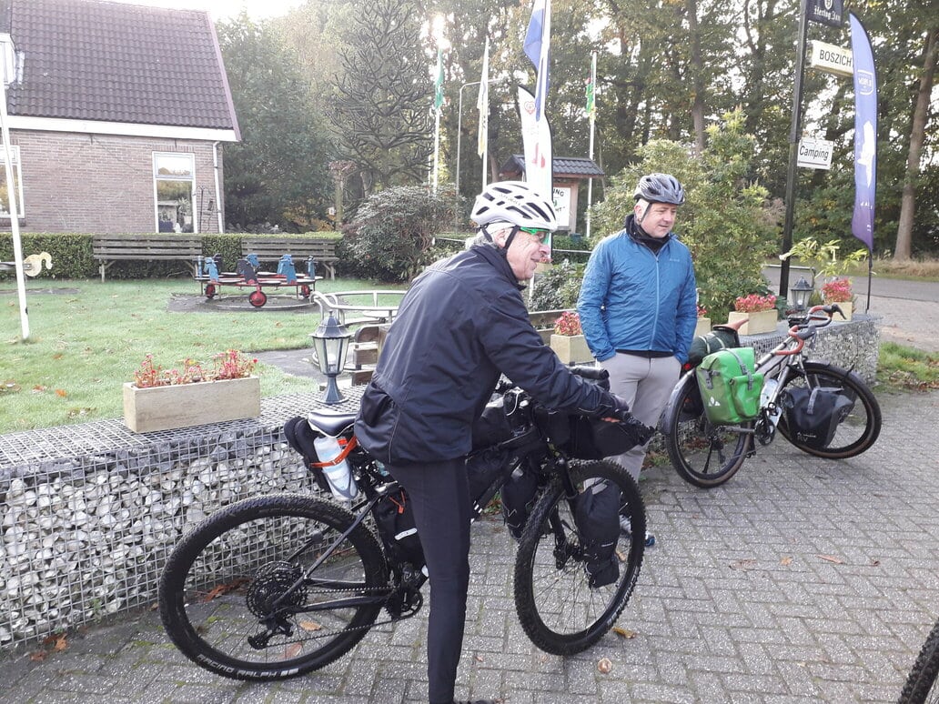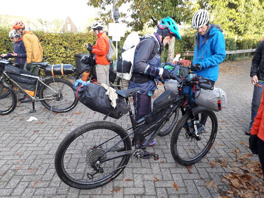 Hans fietst op een mooie mountainbike zonder motor van het merk Avaghon en heeft geen motor nodig. De andere deelnemers hebben ook allemaal mooie fietsen, de meeste zijn mountainbikes met bikepacking tasjes maar je ziet ook een Santos voorbij komen met 2 voor en 2 achtertassen. Het is maar net wat je zelf het fijnst vind!