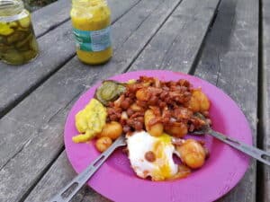 Dit Captain’s dinner met ei is voor 2 personen. Grote eters moeten misschien wat meer kopen maar ik heb van onderstaande in mijn eentje 2 dagen achter elkaar gegeten. De augurken en piccalllily zijn naar smaak toe te voegen en (ik snap m) zijn zwaar in je fietstas. Maarruh..ik vond het wel heel lekker erbij. Nadat ik wat in een klein plastic bakje heb gedaan voor de volgende dag geef ik de potjes een andere campinggast of laat ze staan (als er een koelkastje is).