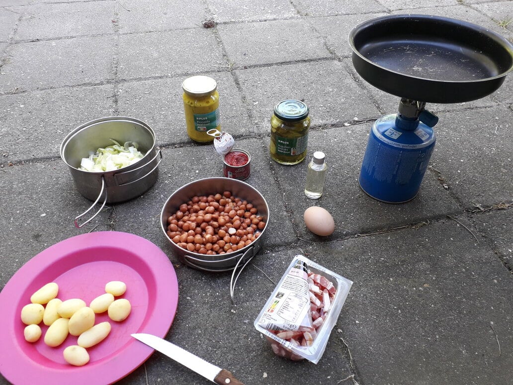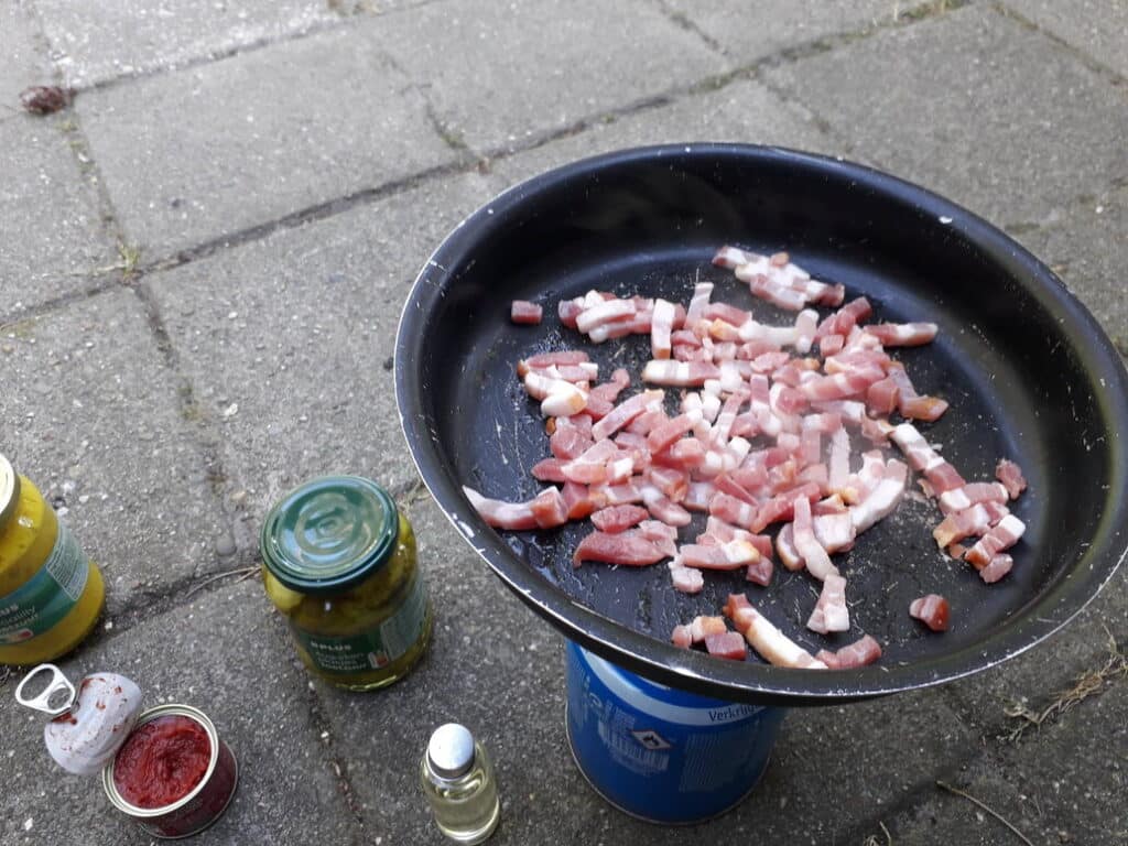 Tip 1: Het is misschien handig om vlak voor je bij een camping bent, de ingredienten te kopen. Omdat het best veel is als je ook een potje picalilly en augurken erbij koopt. Zelf hou ik altijd wat ruimte over in 1 fietstas voor wat boodschapjes.