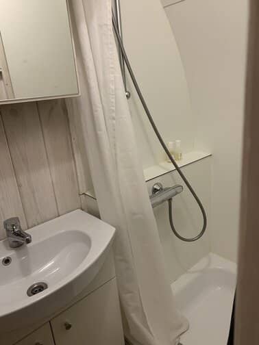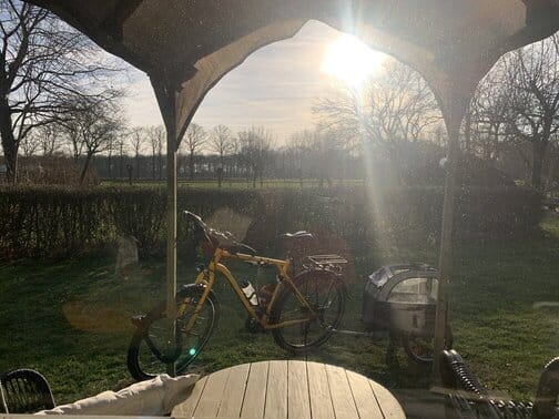 Wij hadden voor dit fietsweekend van de Wereldfietser een prachtig tiny house voor 3 personen. Super romantisch, een bed van 1 meter twintig breed en een slaapbank. Een klein keukenaanrechtje met magnetron en koelkast. Geweldig toch! En een mooi uitzicht!